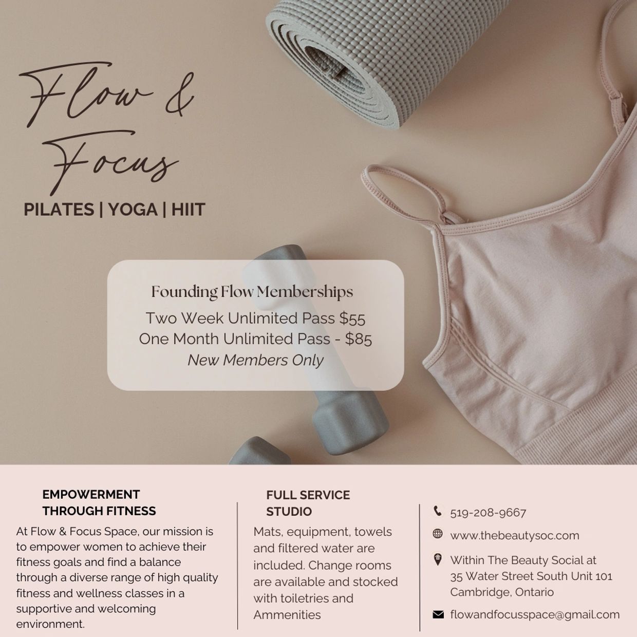 Flow & Focus Space is a serene yoga studio in Cambridge, ON, offering a variety of yoga classes and mindfulness workshops to foster personal growth and community connection.